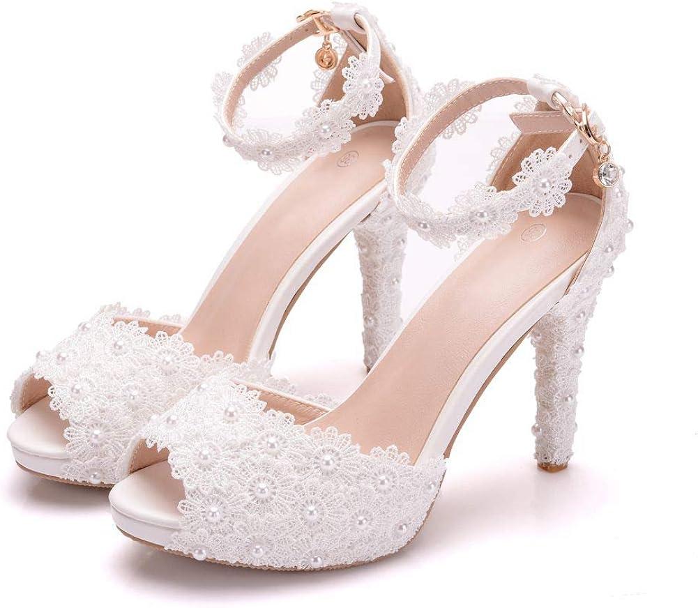 Amazon Com Besoogii Peep Toe White Lace Flowers Pearl Women