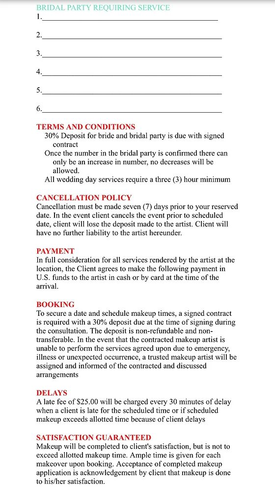 Makeup artist makeup contract for wedding. For example if youre working with a bridal makeup client youll need her wedding date and time venue address colors the total number of people who need makeup and hair services. The final balance is due on the day of the event as one payment when makeup artist arrives no exceptions. Any skin condition should be reported by the client to the makeup artist prior to application and if needed a sample test of makeup may be performed on the skin to test reaction.