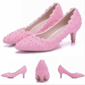 Handmade Kitten Heel Shoes White Pink Lace Pearls Women Wedding