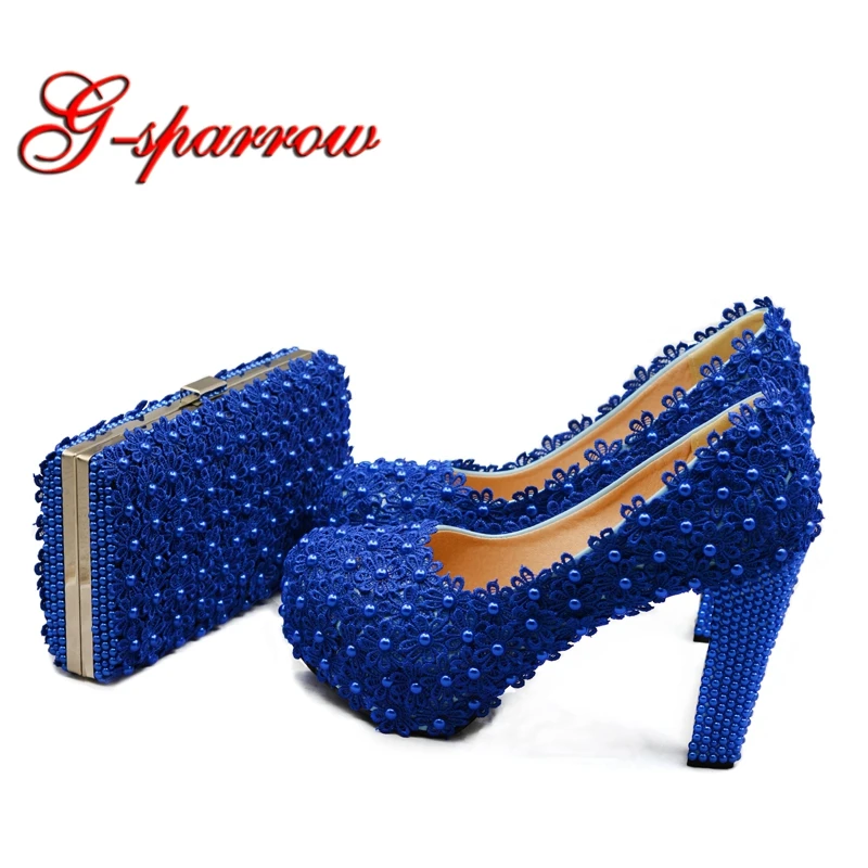 Blue Lace Bride Shoes Thick High Heel Wedding Dress Shoes With