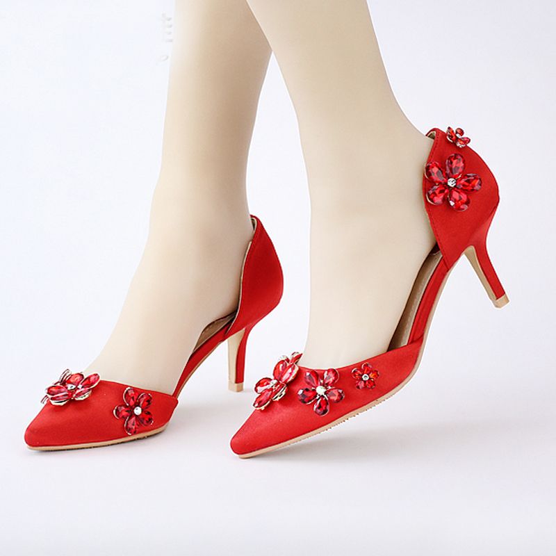 Peep Toe Satin Rhinestone Low Heel Pink Evening Wedding Shoes Online