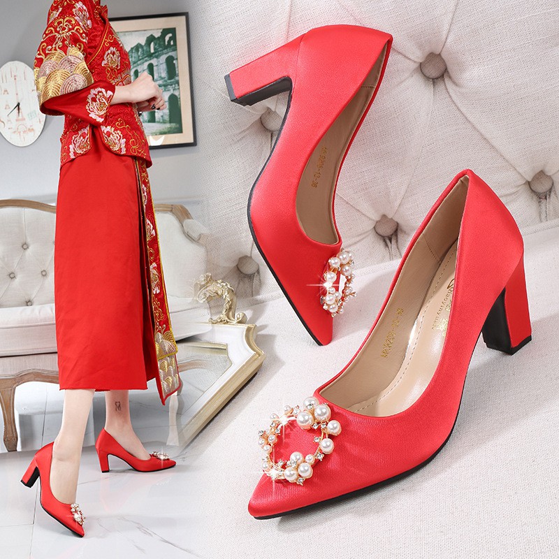 Wedding Shoes Pearl Buckle Pointed Thick With High Heel Bridal