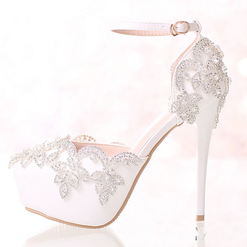 White Bridal Wedding Dress Shoes With Ankle Straps Round Toe