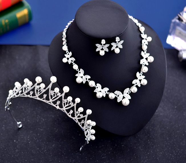 Pearl Bride Wedding Jewelry Sets Simple Necklace Earrings Crown