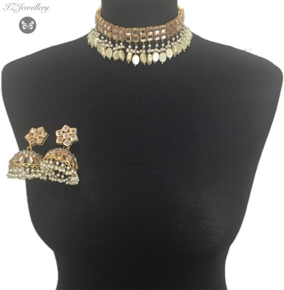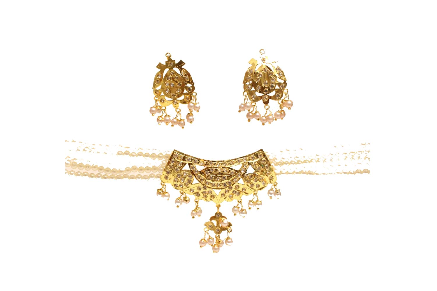 Bridal Jadau Necklace Set Choker Pearl Gold Pendant Necklace With